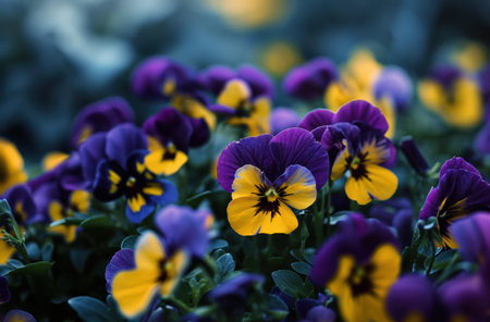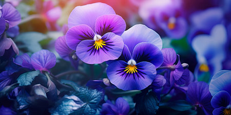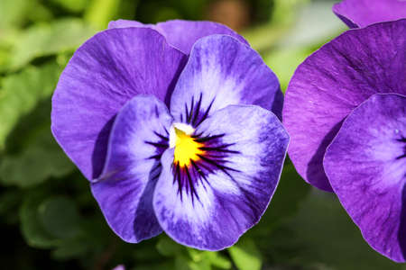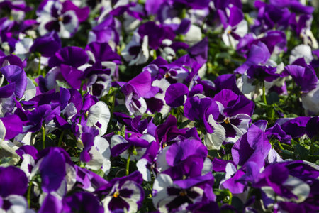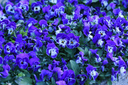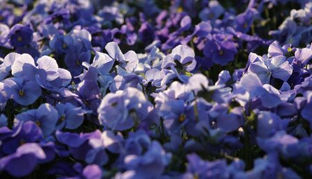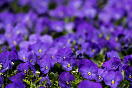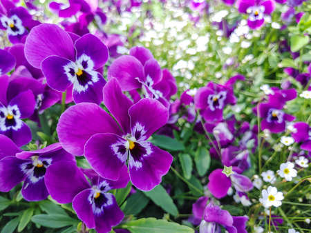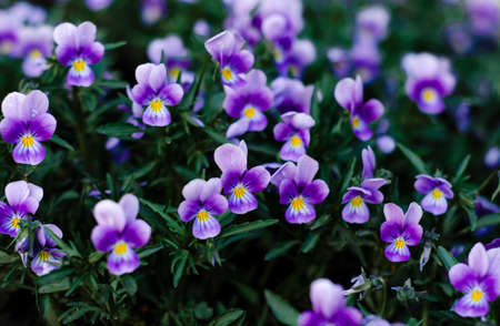 Purple pansy flowers blooming in springtime. Floral background