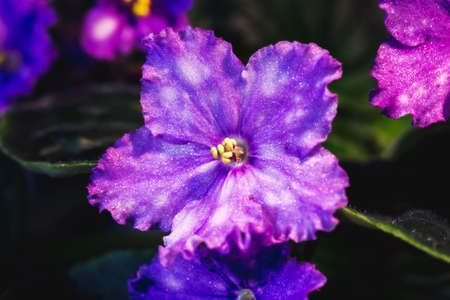 Blooming Indoor plant African Violet or Saintpaulia ionantha, large purple flowers with pink dots. Houseplant for home decor. Close up, selective focus.