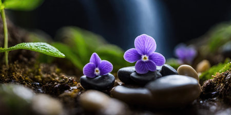 zen basalt stones with violet flowers, zen garden concept, selective focus