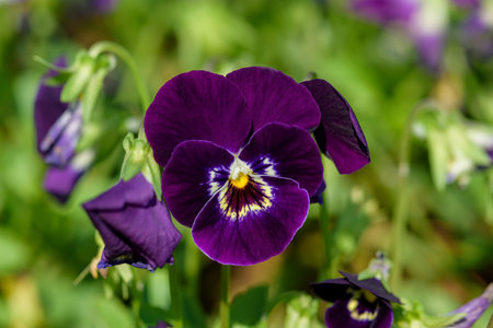 Close up Viola flowers blooming in the garden with a blurred background in spring. selective focus