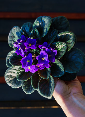 Saintpaulia,Purple African violet in a flowerpot on the background of wood planks
