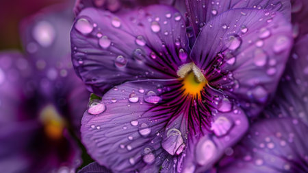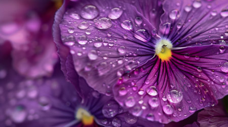 Tiny raindrops decorating the velvety surface of a purple pansy flower, enhancing its natural colors.