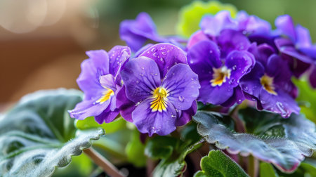 This stunning close-up features vibrant purple violet flowers adorned with dewdrops, showcasing their delicate petals and lush green leaves. Perfect for nature enthusiasts.