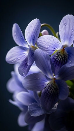 Beautiful blue viola flowers with water drops on dark blue background