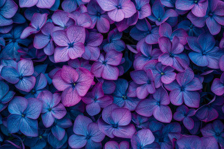 Closeup of vibrant blue and purple hydrangea flowers, creating a mesmerizing floral texture