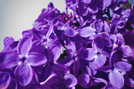 Fresh branches of lilac flowers close-up on a blurred background, spring background.