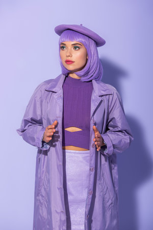 Portrait of a sporty fashion woman posing smiling with teeth and pointing a finger at the camera in a purple yoga tracksuit and a transparent cap on a purple monochrome background