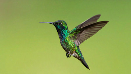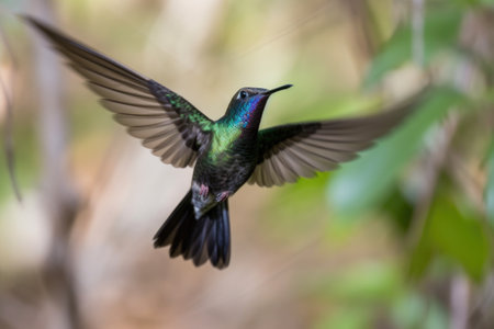 A close-up captures a hummingbird in mid-flight, displaying open wings against a blended background. The bird features iridescent green feathers contrasted by dark wings and tail. The image utilizes soft lighting, creating a focus on the subject and suitable for various visual applications.