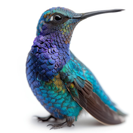 A stunning iridescent hummingbird is captured in a moment of perfect stillness while hovering in mid-air.