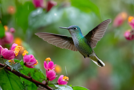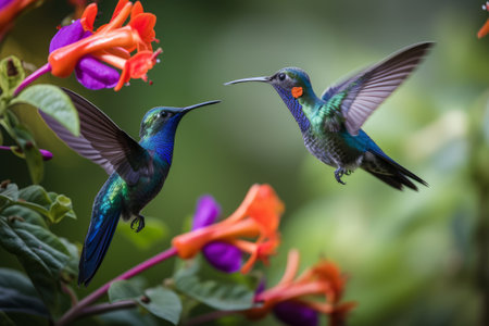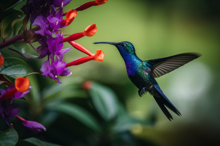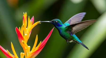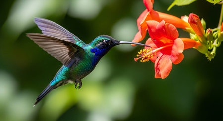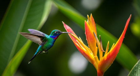 a hummingbird sipping nectar from tropical flowers, created with generative ai