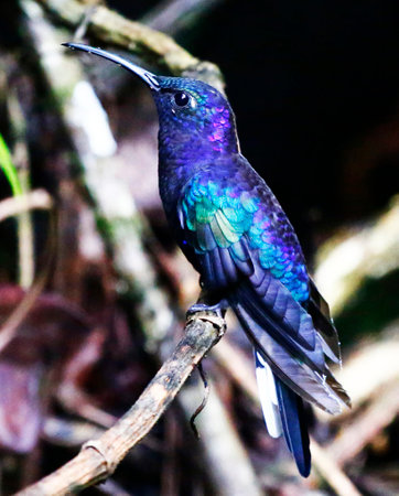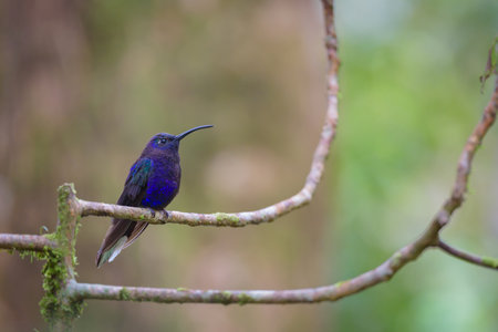 Velvet-purple coronet (Boissonneaua jardini) posing on a Branch. Unfocused background. Mindo, Ecuador