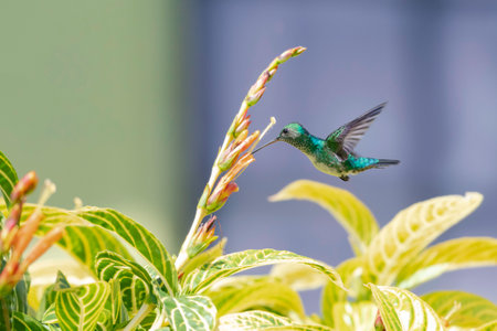 A detailed image captures a hummingbird suspended in mid-air. Its iridescent green and blue feathers are the focal point, contrasted against a soft, blurred background. The composition highlights the bird's wings in motion. This photograph is suitable for various editorial and commercial applications.