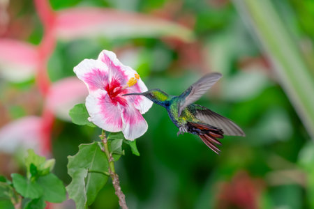 A hummingbird hovers gracefully in front of blooming flowers, showing its iridescent feathers in a lush, tropical setting.