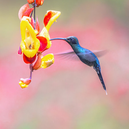 Hummingbird feeding on pink flower in garden, Ecuador, South America