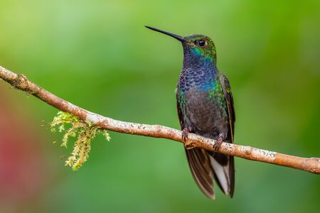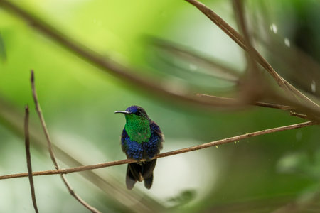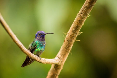 Green-crowned woodnymph sitting on branch, hummingbird from tropical forest,Ecuador,bird perching,tiny bird resting in rainforest,clear colorful background,nature,wildlife, exotic adventure trip
