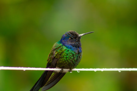 A swallow-tailed hummingbird perched on a branch under rain. Species Eupetomena macroura also know as Scissor Hummingbird. Photo captured in August 2024, in Santa Catarina, Brazil.