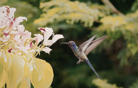 The delicate hummingbird flits gracefully in the air its wings a blur as it hovers near colorful blooms in a verdant garden. Sunlight filters through the leaves highlighting the rich greens and reds of the surrounding flora