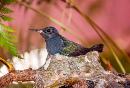A stunning, iridescent Blue-chinned Sapphire hummingbird, Chlorestes notata, perches in a Vervain bush in a tropical garden.