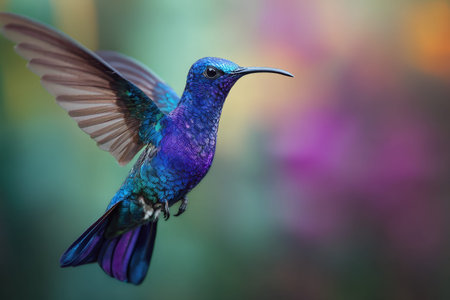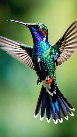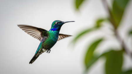 A vibrant hummingbird is captured mid-flight with wings spread, showcasing its colorful plumage. The image highlights shades of green, blue, and purple, with a soft-focus background of leaves. The scene suggests a natural outdoor setting, suitable for illustrating topics related to wildlife, nature, or environmental conservation.