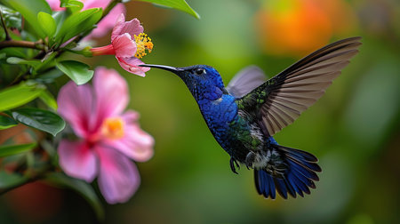 Vibrant blue hummingbird in flight feeding on nectar from a pink hibiscus flower