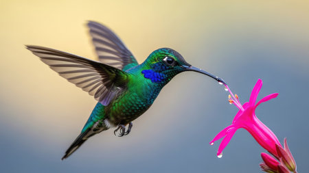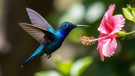 A vibrant hummingbird is captured in mid-flight, delicately feeding from a bright pink flower. The image showcases the bird's iridescent green and blue plumage. Soft, natural lighting highlights the fine textures, suggesting a daytime outdoor setting. This photograph could be used for various commercial or editorial purposes.