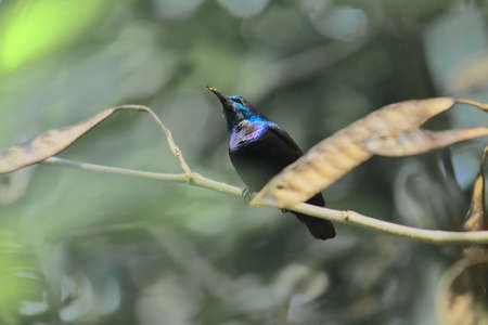 a colorful male purple sunbird (cinnyris asiaticus) in breeding plumage, perched on a branch in countryside of west bengal, india
