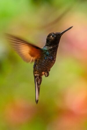 A vertical closeup shot of a flying violet sabrewing hummingbird.