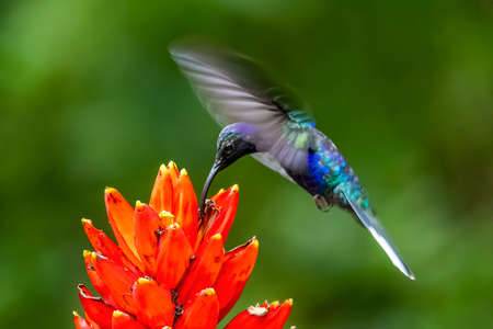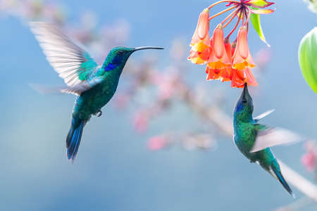 Blue hummingbird Violet Sabrewing flying next to beautiful red flower. Tinny bird fly in jungle. Wildlife in tropic Costa Rica. Two bird sucking nectar from bloom in the forest. Bird behavior