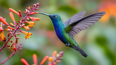 Colorful hummingbird hovers while feeding on vivid orange blossoms