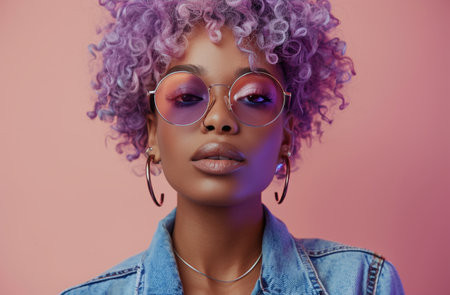 A woman with purple, curly hair is wearing round sunglasses and a denim jacket. She is standing in front of a pink background and looking directly at the camera.