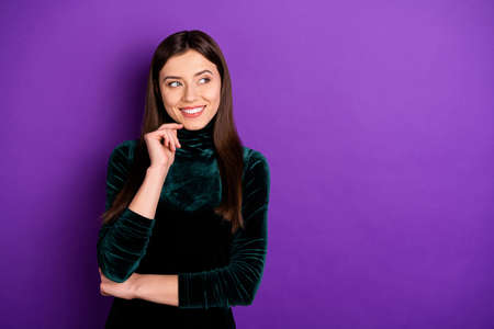 Profile side view portrait of charming chic cheerful girl wearing cool festal look copy space isolated over bright violet color background