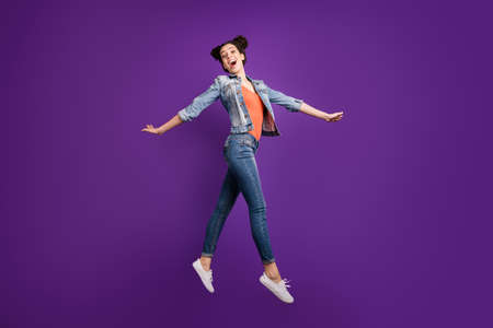 Full length profile photo of funny student lady jumping high amazing mood walking down street wear casual denim trendy clothes isolated purple color background