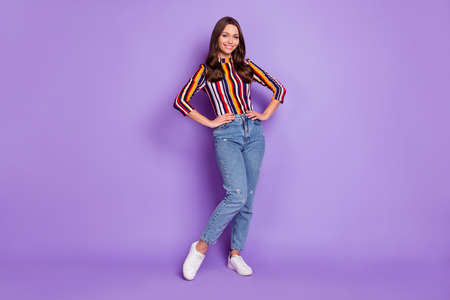 Full body photo of nice hooray young lady look empty space wear striped pullover jeans isolated on violet color background