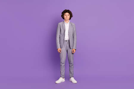 Photo of calm concentrated confident pupil schoolboy guy posing wear grey suit isolated violet color background