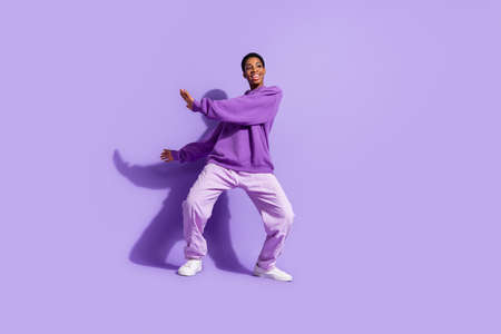 Full length photo of sweet millennial guy dance wear hoodie pants sneakers isolated on violet color background