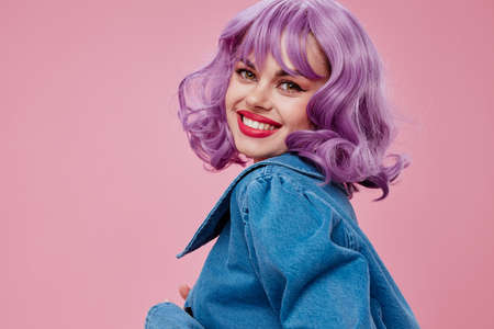 Beautiful fashionable girl wavy purple hair blue jacket emotions fun studio model unaltered