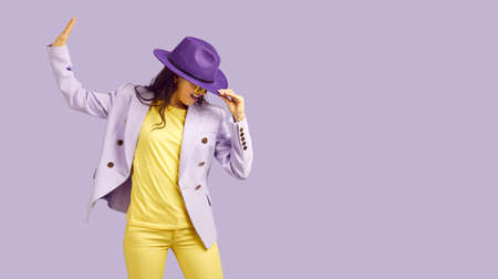 Cheerful charismatic stylish woman having fun and dancing isolated on pastel purple background. Cool smiling woman in fashionable bright clothes dances holding hat near copy space. Banner.