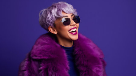 Portrait of a beautiful fashionable woman in purple fur coat and sunglasses