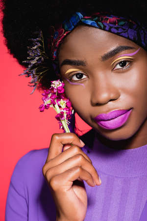 african american young woman in purple stylish outfit with flowers in inhaler isolated on red