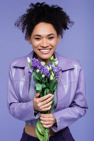 positive young african american woman holding bouquet of violet flowers isolated on purple