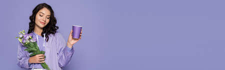 happy young woman in raincoat holding bouquet of flowers and paper cup isolated on purple, banner