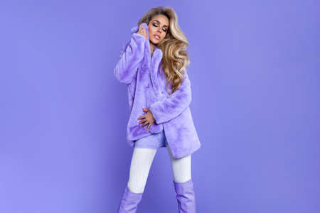 Winter fashion. Beautiful happy blonde woman in lilac fur on a purple background in studio. The model is wearing a stylish violet fur coat, purple sweater and lilac boots. Vogue. Colorful fashion.