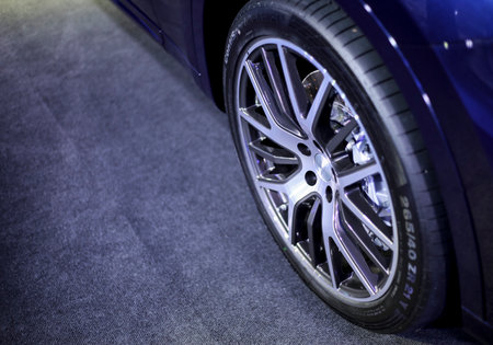 Thailand - March 26 : Close up shot of front wheel from Mitsubishi Concept GR-HEV on display at the 34st Bangkok International Motor Show on March 26; 2013 in Bangkok, Thailand.