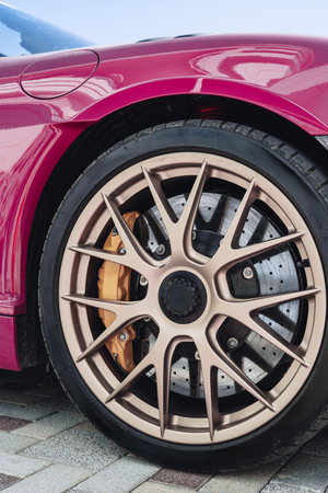 Exclusive tuned car disk close-up. Tuned disk on a sports car for drifting.