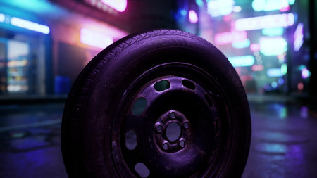 In a vibrant city at night, a solitary tire rests on a wet street, illuminated by colorful neon lights reflecting off nearby buildings, creating a striking urban atmosphere.