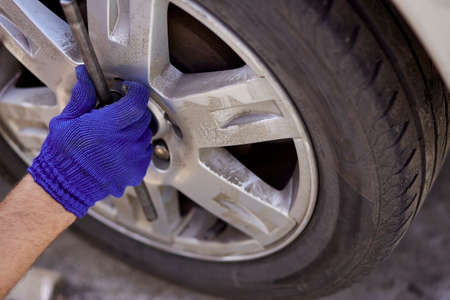 Close up of changing tires on the car with tools. Seasonal needs for safety. Safety concept. Lifestyle photography.