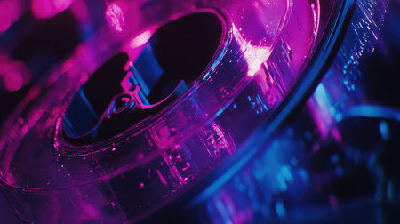 Close-up of metallic brake disc on car wheel in neon light. concept of automotive engineering, precision mechanics, modern vehicle design, innovative technology.