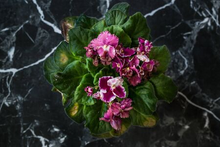 Violet Flower in Pot with Granite Surface. Top View at Home.