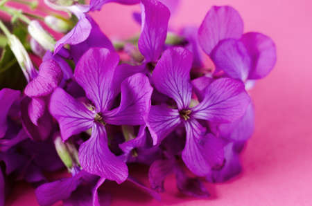 Small purple flower. Spring violet phlox flower against color background. Spring seasonal background.