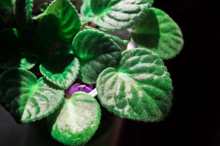 Leaves of African Violet Flower . Green leaves at black background